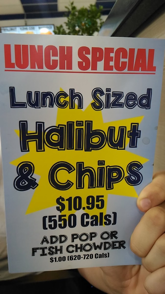 Our signature cut Alaskan halibut lunch size (3oz), served with chips. (620 Calories).
